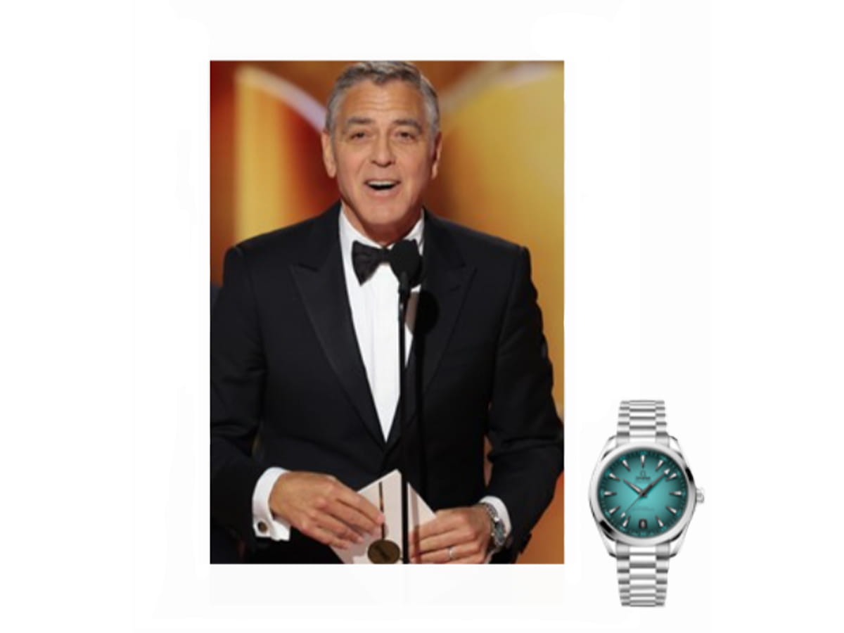 Nominated for Best Performance by a Male Actor in a Motion Picture – Musical or Comedy for his role in “Jay Kelly”, OMEGA Ambassador George Clooney wore a 41 mm OMEGA Seamaster Aqua Terra in stainless steel with a turquoise gradient dial. (220.10.41.21.03.006)