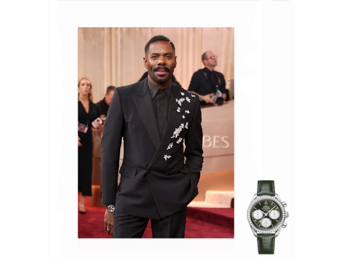 OMEGA Friend of the Brand and Presenter, Colman Domingo wore a 38 mm OMEGA Speedmaster in stainless steel with a diamond-paved bezel and green dial on a green leather strap. (324.18.38.50.60.001)